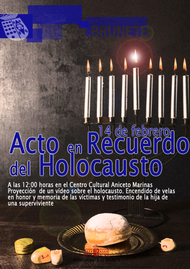 El 14 de febrero, en el Centro Cultural Aniceto Marinas de Brunete, se celebrarán varios actos en recuerdo del Holocausto Judío. A las 12 se proyectará un vídeo, habrá un encendido de velas en memoria de las víctimas y podremos conocer el testimonio de la hija de una de ellas.