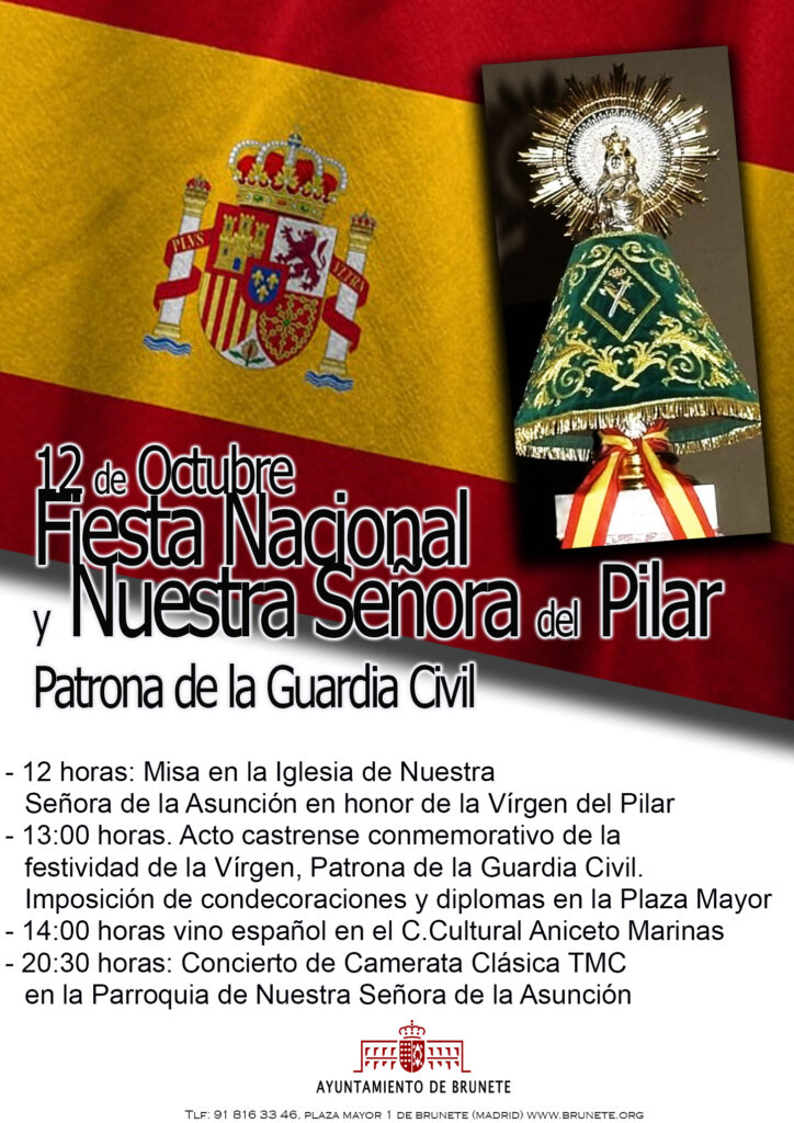Este sábado 12 de octubre celebramos la Fiesta Nacional y Nuestra Señora del Pilar, patrona de la Guardia Civil. Como en años anteriores hay una serie de actos programados: