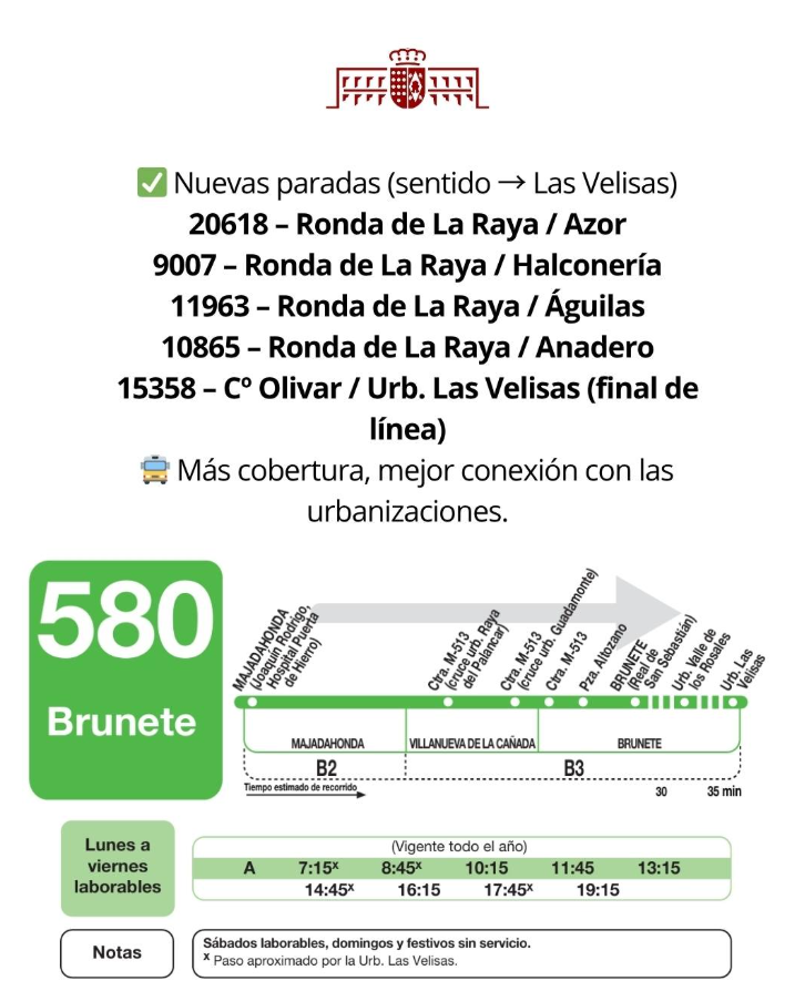 Si eres usuario de la línea 580 esta información te interesa. A partir del 13 de octubre, amplia su recorrido a La Raya del Palancar y Las Velisas. Se eliminan las paradas de las calles León Felipe y Emilia Pardo Bazán, calle Antonio Machado con Camino de la Raya.