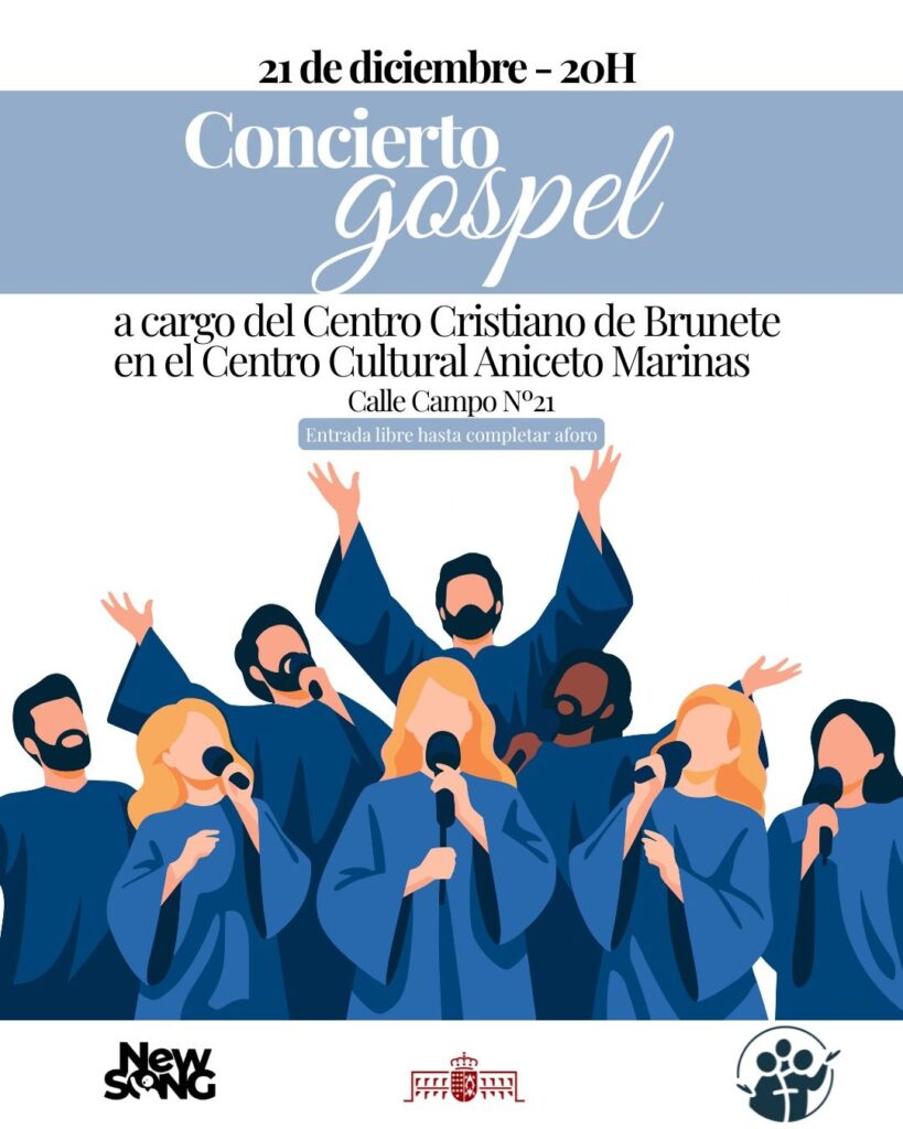 Tenemos más música de la buena para celebrar esta navidad. El 21 de diciembre el Centro Cristiano de Brunete ofrecerá un concierto gospel a las 20 horas, en el Centro Cultural Aniceto Marinas de Brunete. Entrada libre hasta completar aforo.