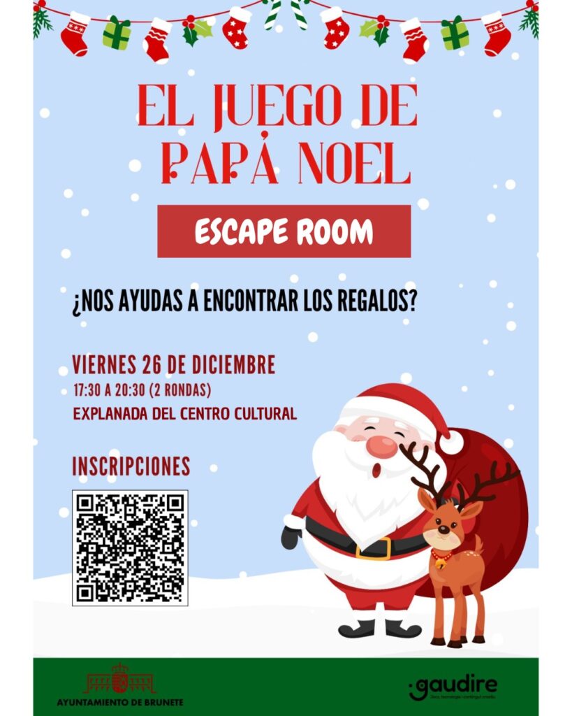 Pasa una tarde entretenidísima, el viernes 26 de diciembre de 17:30 a 20:30 horas, en la explanada del Centro Cultural Aniceto Marinas con el escape room del Papá Noel ¿Nos ayudas a encontrar los regalos?