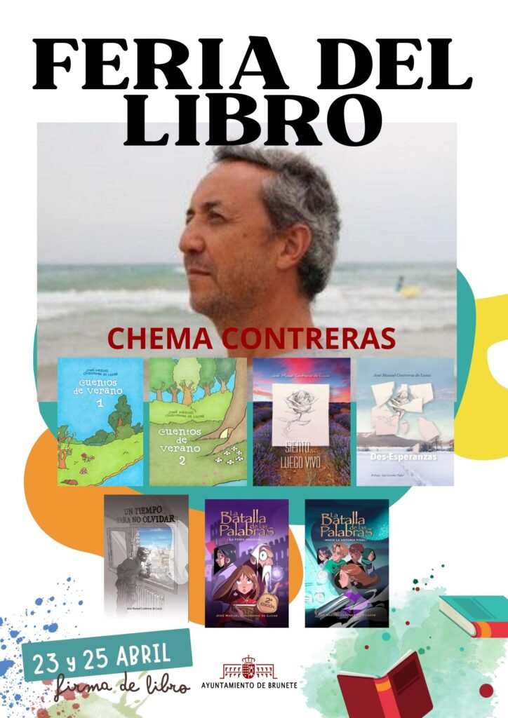 Nuestra Feria del Libro trae a Brunete al escritor Chema Contreras el 23 y el 25 de abril. Si no quieres perdértelo, si quieres conocerle o a otros autores, comprar sus obras y que te las firmen, no olvides consultar el programa de firmas: Venta de Libros | Web del Ayuntamiento de Brunete. El 23 de abril a las 19:30 horas, también nos presentará sus libros LA BATALLA DE LAS PALABRAS.