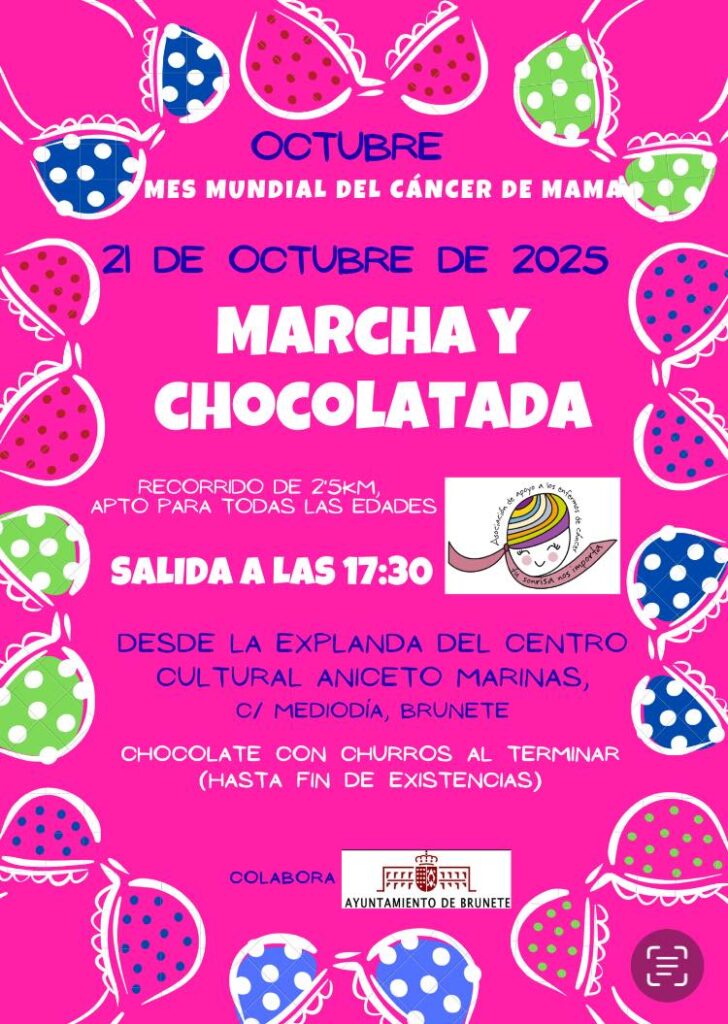 Con motivo del mes mundial del cáncer de mama, el 21 de octubre celebraremos una marcha de 2,5 kilómetros por las calles de Brunete con una estupenda invitación de chocolate con churros al final. La salida será a las 17:30 horas en la explanada del Centro Cultural Aniceto Marinas.