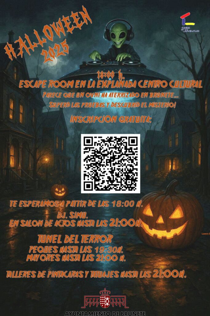 La fantasía, la imaginación, y el terror tienen un día dedicado, se trata de HALLOWEEN, que celebramos en el Centro Cultural Aniceto Marinas con un montón de actividades. Un OVNI ha aterrizado en Brunete y la aventura está garantizada. Si sobrevives habrá talleres, pasajes del terror y la música de DJ Simu. Si quieres pasarlo bien, si te crees muy valiente, no faltes a la cita.