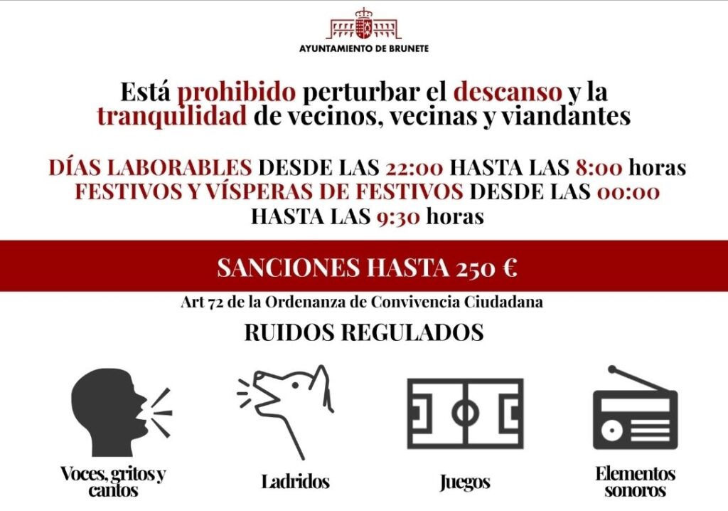 La Ordenanza de Convivencia Ciudadana establece la prohibición de perturbar el descanso y la tranquilidad de los vecinos desde las 22 a las 8 horas en los días laborables y de 00 a 9:30 en festivos y vísperas de festivos con sanciones de hasta 250 €.