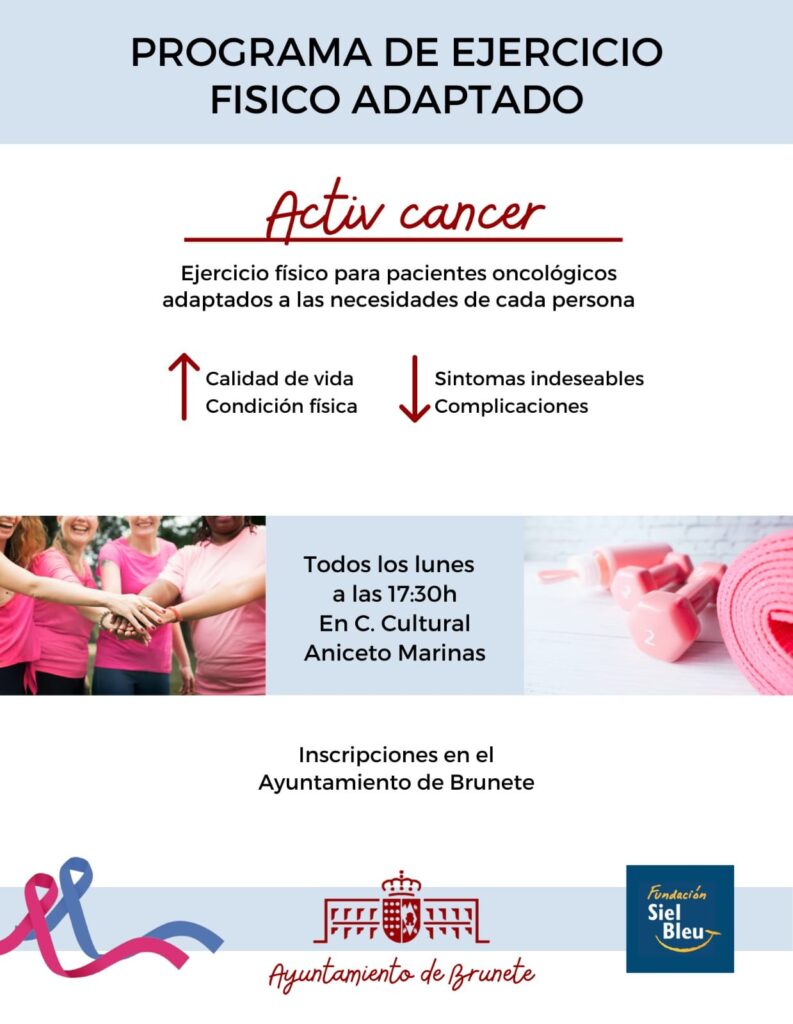 Todos los lunes, a las 17:30 horas, en el Centro Cultural Aniceto Marinas, tenemos organizada una actividad para pacientes oncológicos con ejercicio físico adaptado para mejorar la calidad de vida y reducir los síntomas y las complicaciones que acarrea la enfermedad. Las inscripciones son el en Ayuntamiento de Brunete.