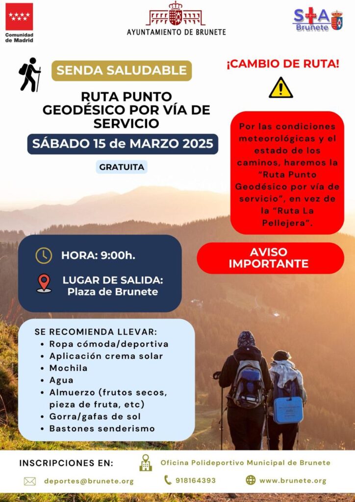 Debido a estas lluvias con las que estamos despidiendo el otoño hemos tenido que cambiar la ruta senderista del 15 de marzo. Seguiremos saliendo a las 9:00 horas de la Plaza Mayor de Brunete, pero esta vez iremos al punto geodésico por al vía de servicio en lugar de ir a la Finca la Pellejera.