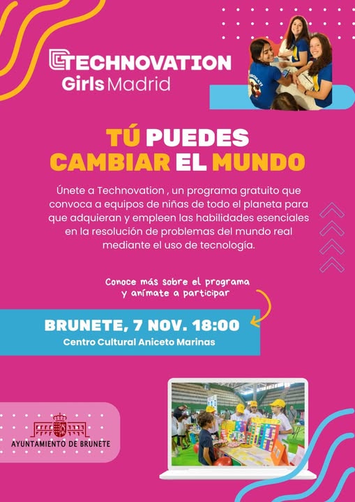 Que no te asuste la tecnología. Technovation Girls llega a Brunete para inspirar a las niñas y jóvenes a usar la tecnología para resolver problemas reales de su entorno. Su formación es gratuita y tendrá lugar el Jueves 7 de noviembre a las 18:00 horas, en nuestro Centro Cultural Aniceto Marinas